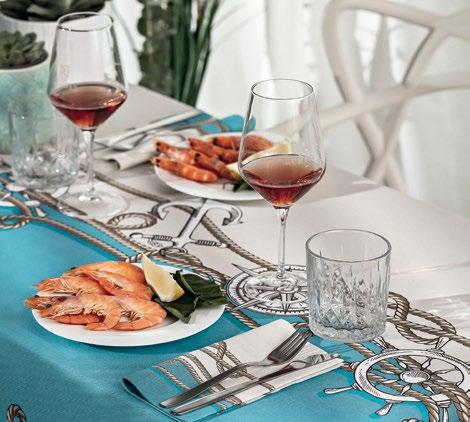 L’illustrazione arborea che si rincorre su questo tovagliato dona all’ambiente una poetica raffinata e originale. The arboreal illustration chasing this tablecloth gives the room a refined and original poetics.