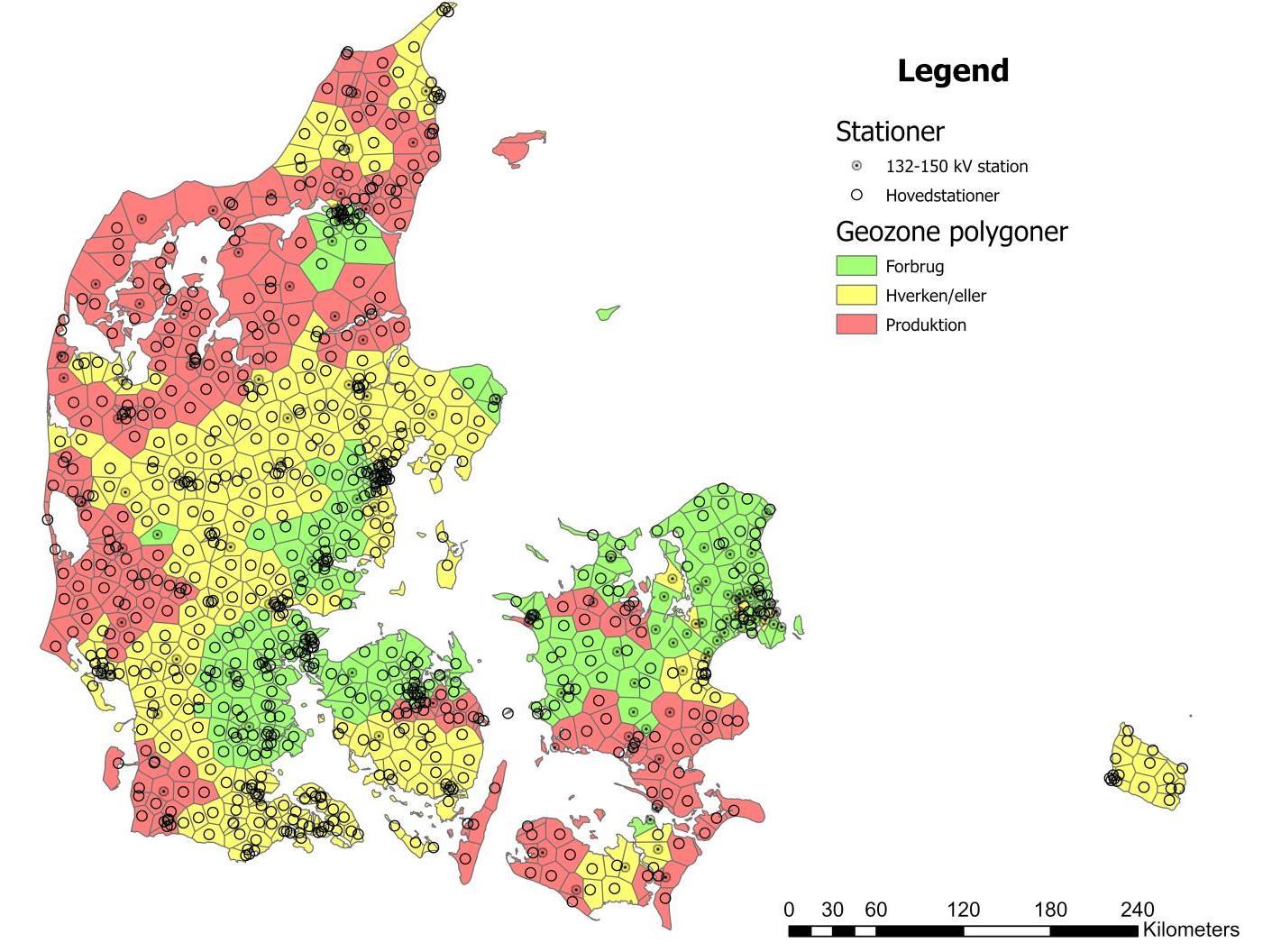 These geographically differentiated tariffs adhere to the specific geozones as seen on Figure 5, which gives an overview of the congestion in the Danish electricity grid. The green areas are defined by an area with a large electricty consumption, thus there will be a larger discount if connecting a new solar or wind park in such a geozone. The green zones are however also defined by being densly populated zones which gives RE-developers NIMBY problems. The yellow zones could be considered a goldilocks