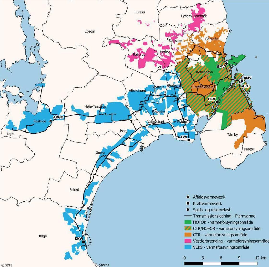 • Det største system dækker den centrale, sydlige og vestlige del af hovedstadsområdet (HOFOR, CTR og VEKS, tæt koblet til Vestforbrænding).