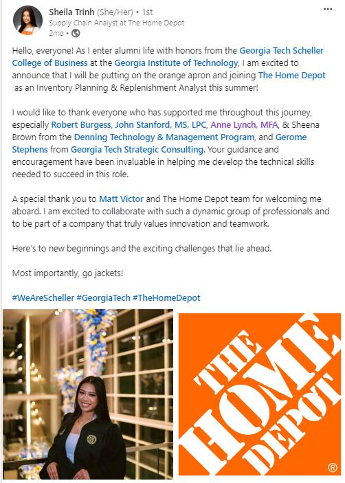 Sheila Trinh (business – operations & supply chain management) announcing her full-time position as an Inventory Planning & Replenishment Analyst at The Home Depot. | Harish Viswanathan (computer science) interning at The Home Depot.
