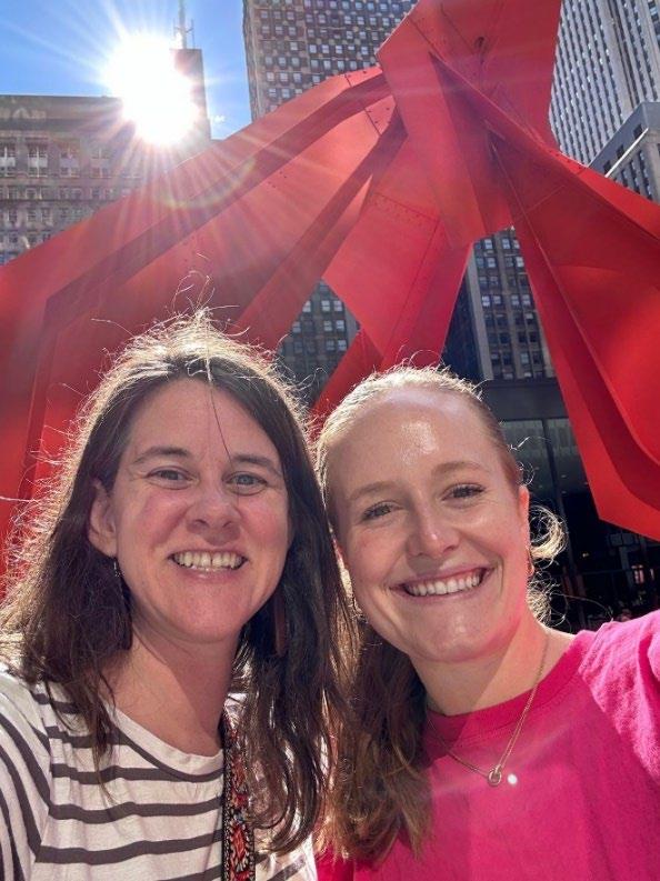 Anne Lynch and Anna Katherine Cates (T&M Class of 2020) in front of “The Flamingo” by Alexander Calder in Chicago, Illinois in June 2024. | Tommy Antonino (T&M Class of 2015), Roshan Balakrishan (T&M Class of 2017), Rishi Patel (T&M Class of 2018), Anne Lynch, Abbie Burton (T&M Class of 2015), and Reena Shah (T&M Class of 2016) at dinner in Chicago.