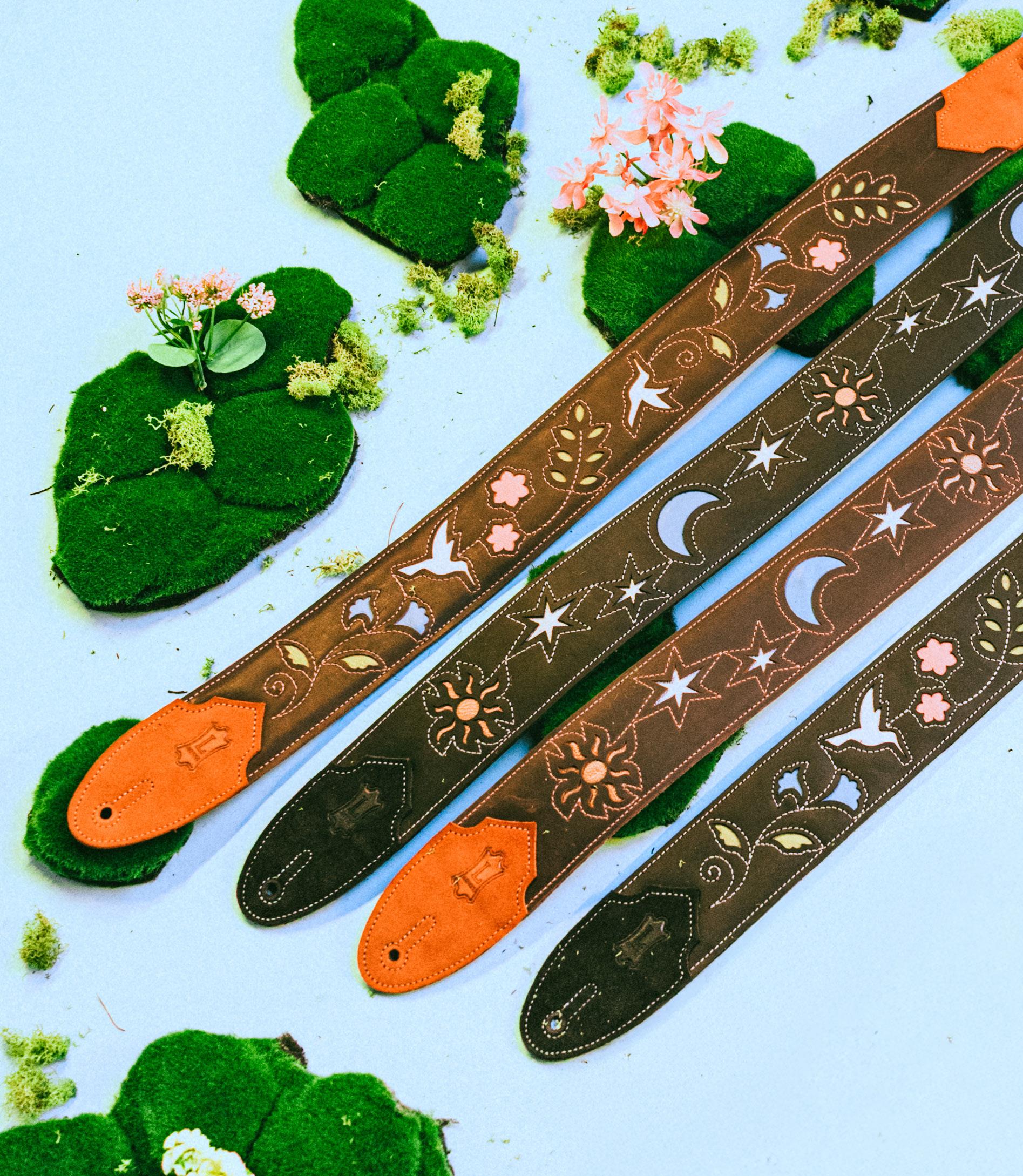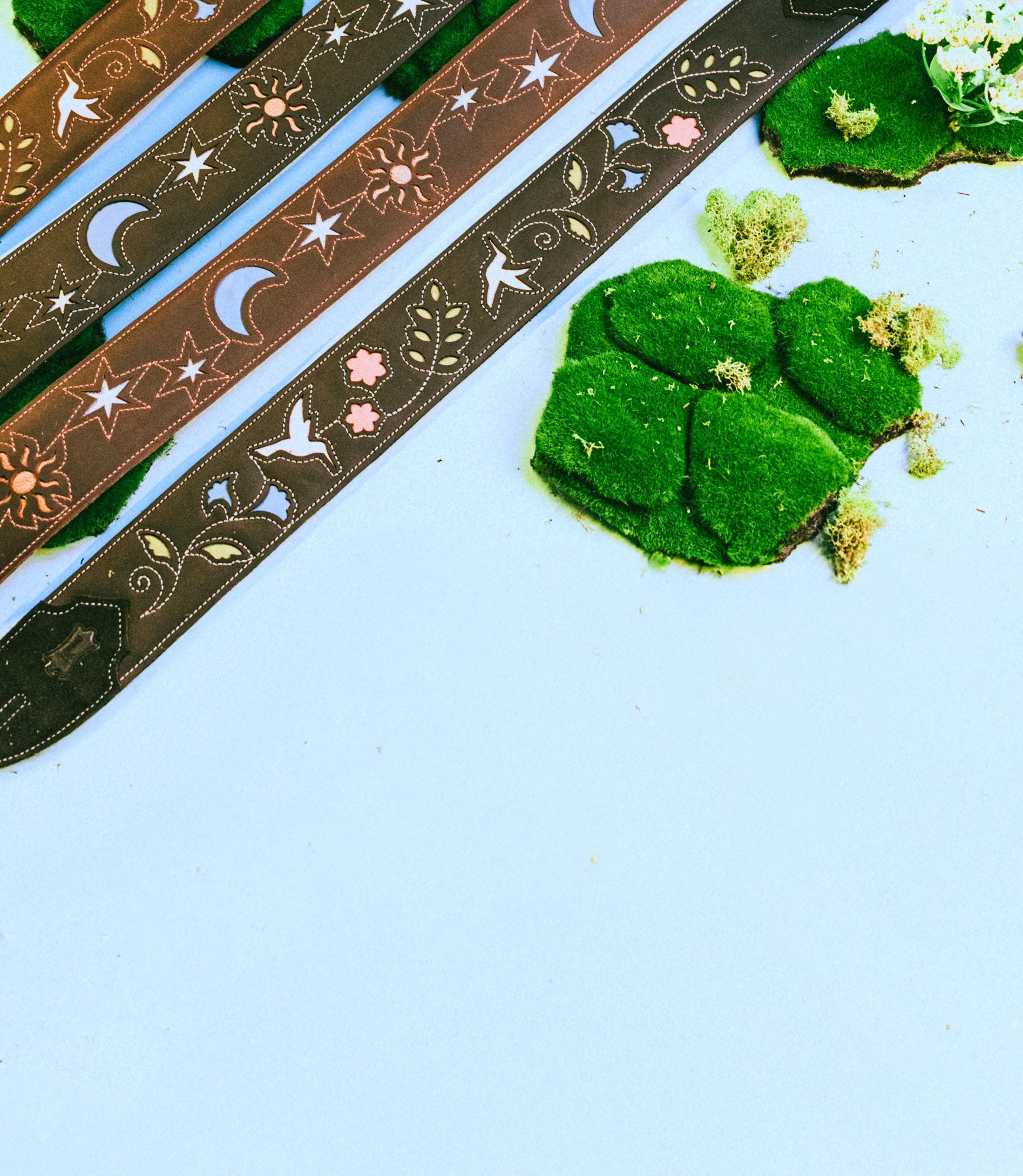 The multi-layered leather construction reveals vibrant underlayers, adding depth and dimension. Designed for beauty and comfort, these padded straps blend artistry and functionality, making them a striking addition to any musician’s gear.