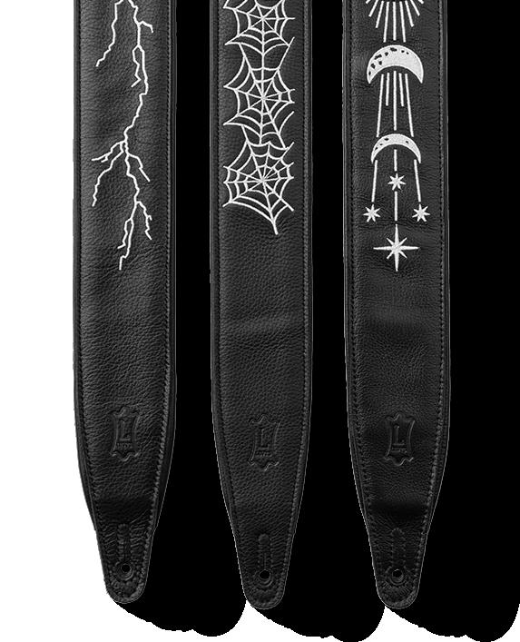 The Night Life Series combines sleek design with an electrifying glow. Each strap features meticulously embroidered designs — celestial moons and stars, lightning bolts, and haunting spider webs — that stand out in the daylight and come to life after dark. Made from ultra-soft, premium black leather for lasting durability, these straps are perfect for players who want a strap that is both comfortable and unforgettable. Charge up the embroidery in sunlight, and watch as it glows in the dark for a thrilling performance-ready look that truly shines on stage!