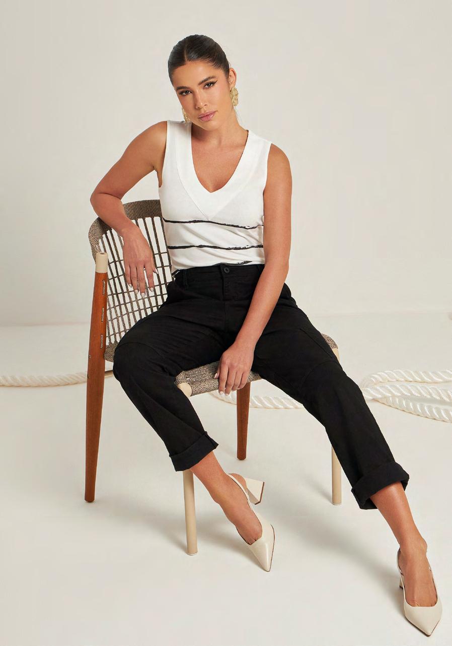 QUANDO ESCOLHER UMA PEÇA MAIS VOLUMOSA AO CORPO, COMO ESSA PANTALONA, EQUILIBRE O VISUAL COM UMA PEÇA JUSTA NA PARTE SUPERIOR DO CORPO.