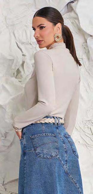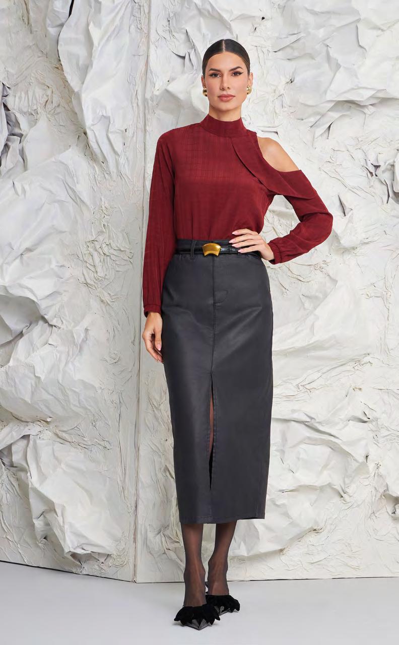 A mistura de materiais estruturados como os PUs com tecidos delicados, cria um contraste sofisticado na hora de construir os looks. Pensamos em uma coleção funcional, altamente coordenável, inclusive, para combinar com as peças da coleção Tropical 2025, formando looks incríveis para dias de meia estação.