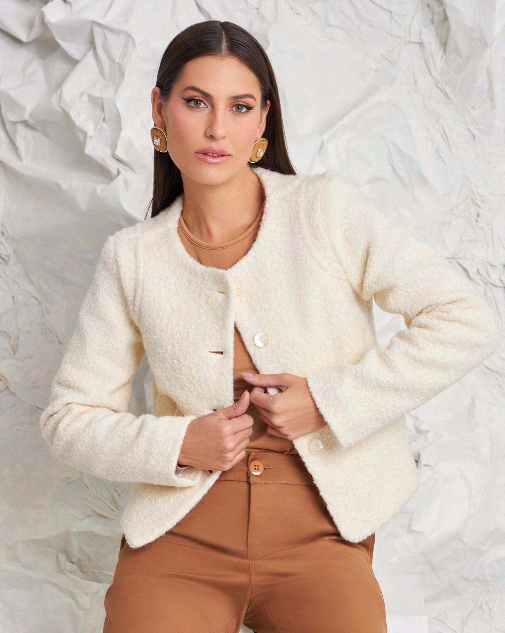 Sim, nós amamos as texturas teddy, quentinhas como um abraço de urso! O modelo de casaco mais curto esquenta e não pesa em dias mais amenos.