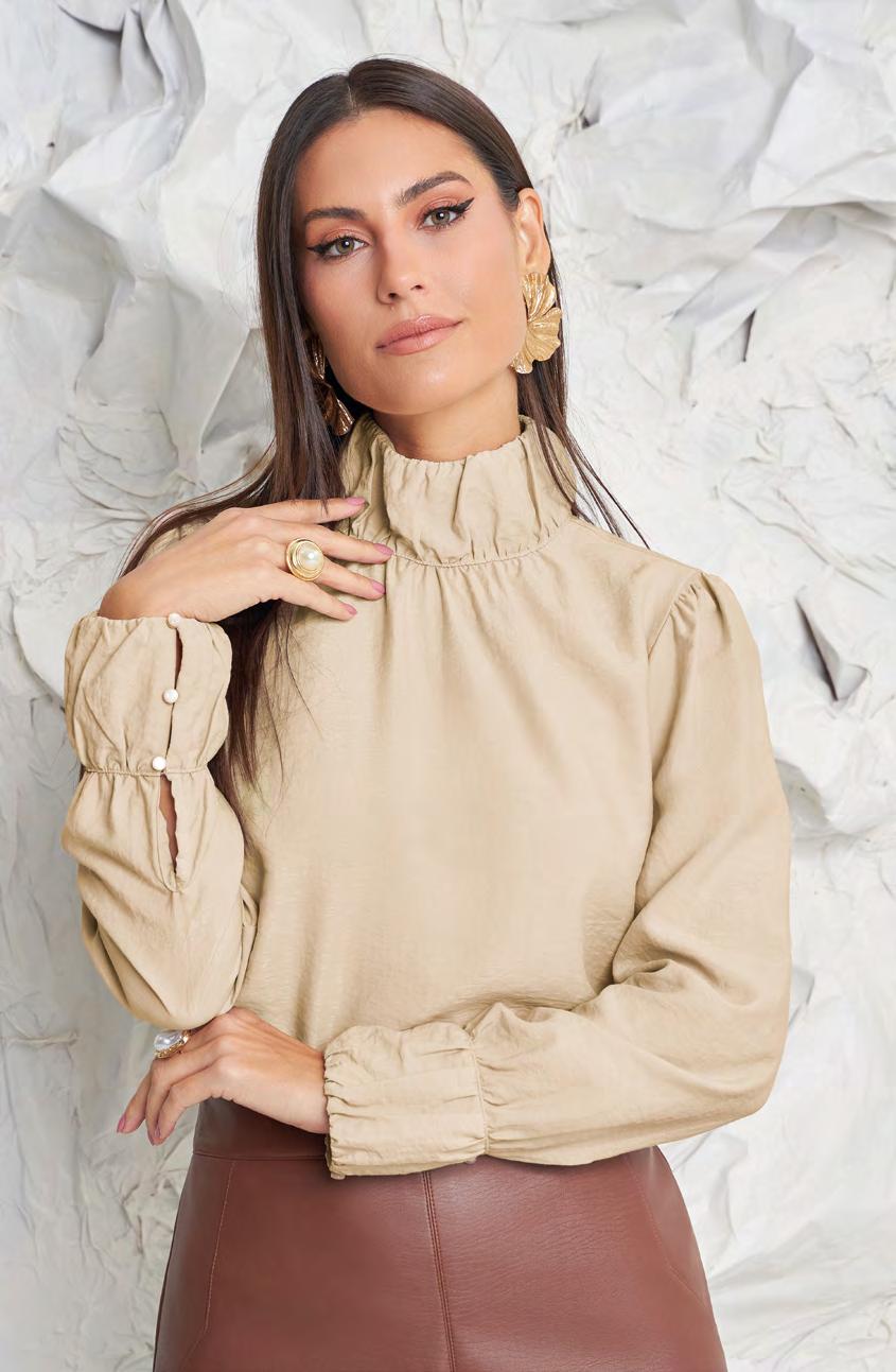 Surpreenda nos detalhes! Gola e mangas com volume tiram a blusa elegante do comum, elevando o poder da produção.