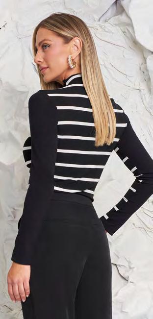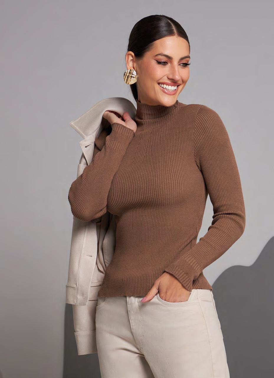 A blusa em tricô com a cintura no lugar e detalhe charmoso na gola e barra é um ótimo acompanhamento para conjuntos em alfaiataria!