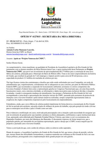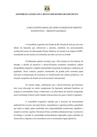 Carta de apoio da Assembleia ao Projeto Natureza da CMPC
