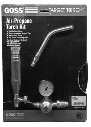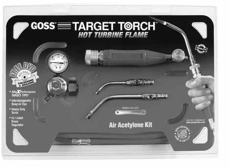 Kits feature the adjustable Target Tips for professional soldering and brazing applications. These tips are very hot and have a compact flame. Kits also include a quick disconnect handle, 12 ft. hose and UL listed regulator. Choose from a wide selection of kits below. • Max performance turbine flame • Adjustable flame feature • Unique mixer design reduces brazing time over conventional tips • Tips have a filler and removeable orifice • Interchangeable with other quick disconnect style tips and equipment • Made of heavy gauge stainless steel and brass