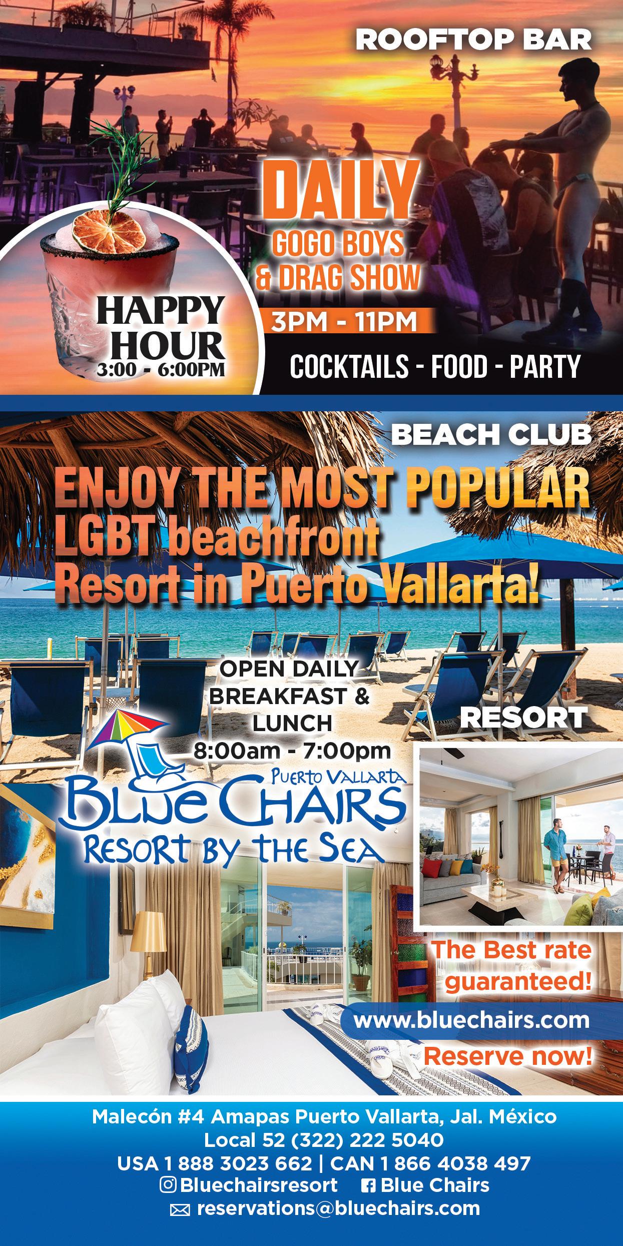 At Blue Chairs Hotel with panoramic & sunset views, Drag Shows, Gogos, great drinks and Sunday Brunch. En Hotel Blue Chairs con vistas de atardeceres y panorámicas, Drag Show, Gogos, excelentes bebidas y brunch dominical.