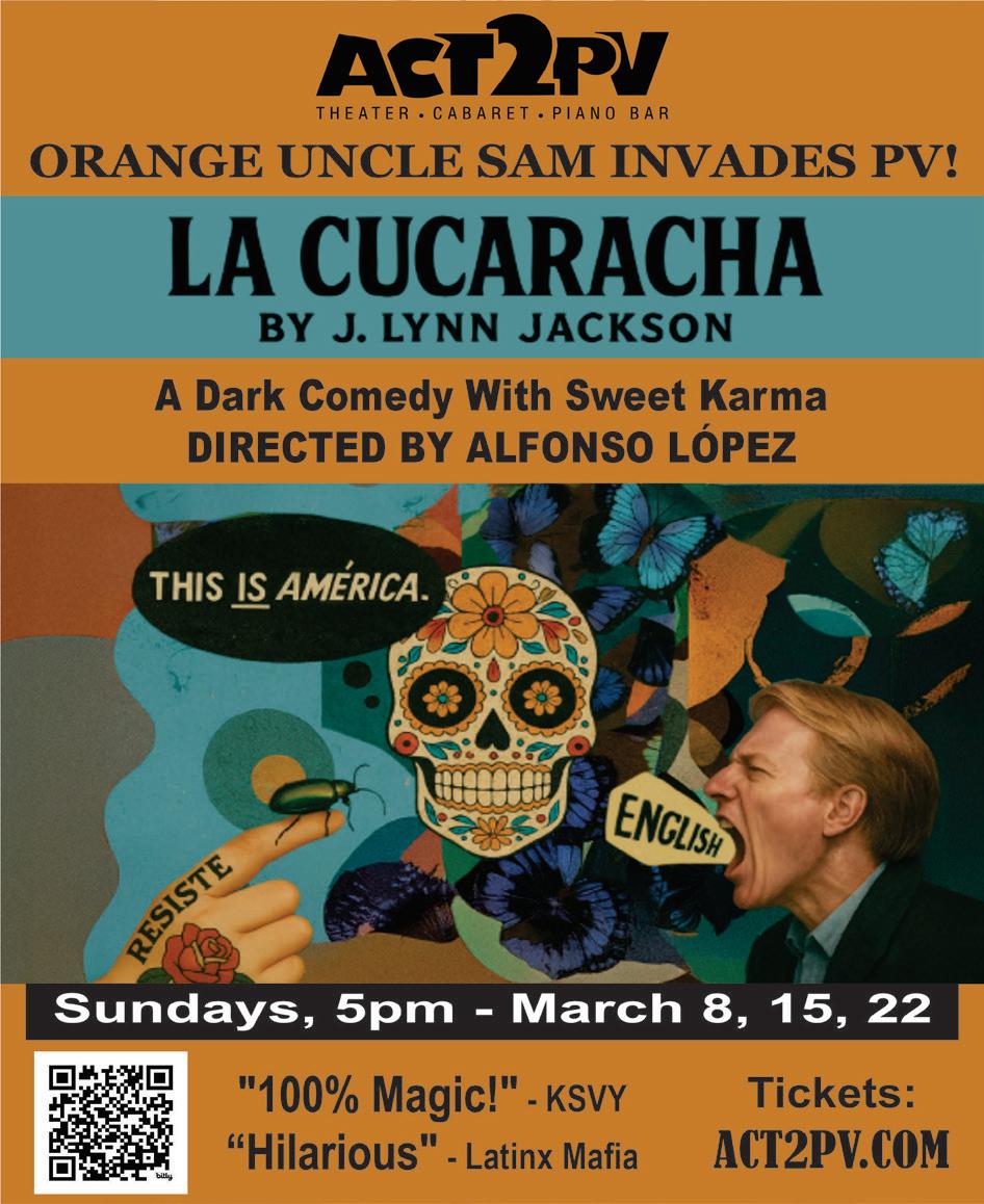 Orange predator “Uncle Sam” from the US invades a celebration of life in PV. June bug Salma joins forces with human Lila to lead the resistance. La Cucaracha celebrates the nature of love, life, death and sweet karma.