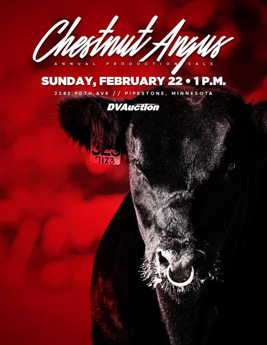 I would like to thank you all for your continued support and interest in our program. We are proud of this set of cattle, excited for their future, and excited as the next generation is hitting the ground now. I would like to thank my family for everything they do, to keep this operation running like a well-oiled machine. We all have different roles within this operation, and it takes all of us to make sure everything gets accomplished. As our family continues to grow, I am excited to see what the future holds for our entire family as it takes all of us working together to make this operation run! Thank you to my friends, customers, and all of the supporters of Chestnut Angus. We all know it takes a lot of people at different times of the year to make everything happen, and your help and continued support is greatly appreciated. Similar to last year, the cattle market has been as good as it has ever been! It is time to trade in those older herd bulls for a new and fresh set of genetics to add value to your operation. It will pay dividends and be very beneficial for many years to come! When you consider the value of Feeder Cattle in the marketplace being sold by the pound, the added value of a performance driven bull justifies the initial expense of that bull, and as a result add more pounds to your calf crop, which results in more dollars in your pocket. These young herd sires provide a tremendous return on investment in today’s cattle market which ultimately is the bottom line in the cattle business. We encourage anyone and everyone to stop by the farm anytime to check out this year’s offering. Please reach out with any questions you may have. Thank You again for your consideration, and we hope to see you on Sunday, February 22nd at the Farm in Pipestone, MN.