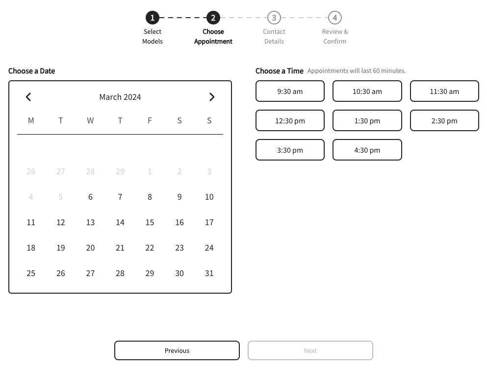 If a car isn’t available or there are no sales executives available, these timeslots will be greyed out so the customer can’t select them.