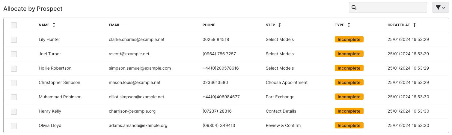 In this section you can unassign or reassign prospects. To do this, click on the tick box on the left and the Reallocate and Unallocate buttons will appear to the top right of the box. You can click on the drop-down menu on the top right to filter by how far in the customer journey a customer came or by their priority.