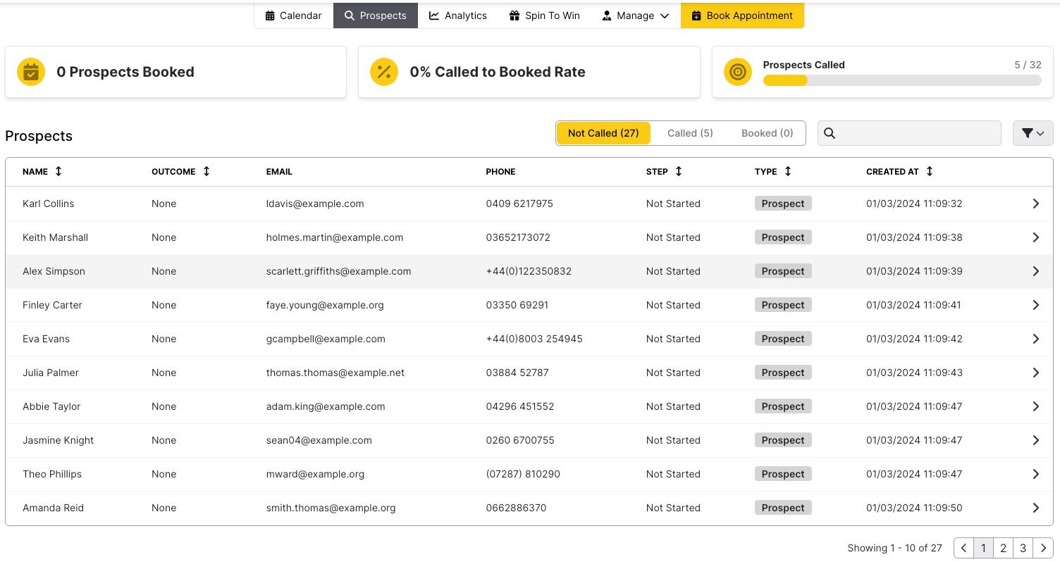 The different outcomes are: Not Interested, Follow Up, No Answer & Booked. Once an outcome has been assigned it will go from the ‘Not Called’ column into the ‘Called’ column so it is easy to track which require a phone call, and which may need an outcome. Each column can be filtered by clicking on the headings. These will filter in ascending or descending order.