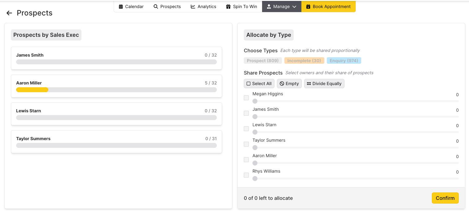 To Allocate prospects, select a priority. Priorities are chosen in the original data that is sent over to us under a header named ‘Priority’. Priorities of “Incomplete” are the incomplete bookings, which are the ones to prioritise. Then select the users to allocate the prospects to by using the and then use the slider to allocate a specific number to each person, or use the ‘Divide Equally’ button. Click confirm to allocate then the box to the left called ‘Prospects by Sales Exec’ will show a tracker as to how many each sales exec has called.