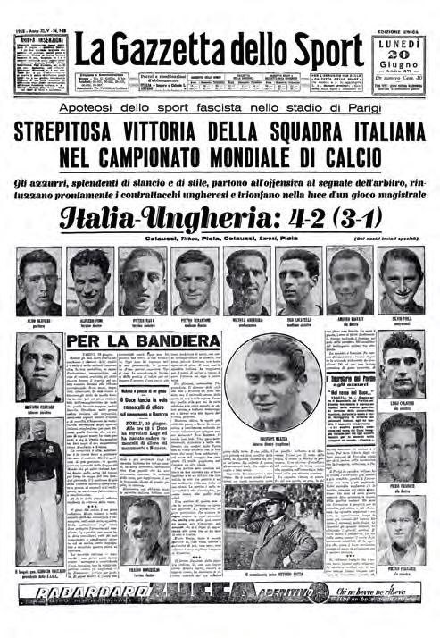 La Nazionale in Francia nel 1938 riconquista il Mondiale con pieno merito Supera il Brasile, batte l’Ungheria in finale e alza al cielo la Coppa Rimet