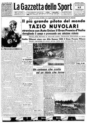 Nuvolari è l’eroe per eccellenza dell’Italia. Le sue imprese entrano nel mito: alla Mille Miglia del 1930 spegne i fari per non farsi vedere da Varzi, poi lo supera a sorpresa. Nel ’31 al circuito delle Tre Province si rompe l’acceleratore e vince con il meccanico che regola il meccanismo con la cintura dei pantaloni. Enzo Ferrari dirà: «Un prodigio insuperato dell’istinto, ai limiti delle possibilità umane e delle leggi fisiche». La guerra lo ferma, Nuvolari è malato ai polmoni ma continua a correre fino al 1950. Non è più lui da quando il destino gli ha portato via i due figli, entrambi giovanissimi. Muore nel ’53 senza aver mai annunciato il ritiro. Al suo funerale partecipa una folla immensa: si dice 50 mila persone. La bara sul telaio di una macchina viene scortata da Ascari, Villoresi e Fangio. Giovanni Canestrini sulla Gazzetta scrive: “Fino a quando poteva correre, sperava forse di fare la bella morte che aveva desiderato; forse in cuor suo si augurava di raggiungere così i suoi ragazzi, combattendo, al volante di una delle sue macchine”. A differenza di tanti campioni Nuvolari è rimasto nella memoria collettiva del Paese. Lucio Dalla gli ha dedicato una canzone: “Nuvolari ha la bocca sempre aperta, di morire non gli importa niente. Corre se piove, corre dentro al sole. Tre più tre per lui fa sempre sette”.