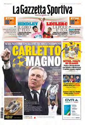 Abbiamo scelto la prima pagina di questa sua quarta Champions per vari motivi. Il primo è che in quella stagione 21-22 il Madrid di Ancelotti fece una serie incredibile di miracoli, di remontadas in serie. La campagna europea dei Blancos iniziò con una vittoria a San Siro contro l’Inter con gol di Rodrygo all’89’, ma l’esplosione avvenne in primavera quando il Madrid negli ottavi perse 1-0 a Parigi, andò sotto anche al Bernabeu e poi s’impose 3-1. Nei quarti col Chelsea dopo aver vinto 3-1 a Stamford Bridge il Real si ritrovò sotto 3-0 in casa, salvo poi rimontare con Rodrygo (80’) e Benzema (96’). La semifinale col City fu memorabile: sconfitta 4-3 a Manchester, rete di Mahrez al 73’ con Guardiola che all’89’ aveva ancora due gol di vantaggio. Tra il 90’ e il 95’ doppietta di Rodrygo e rigore definitivo di Benzema per il 3-1. La finale di Parigi col Liverpool fu decisa da Vinicius, con un Courtois stellare.