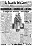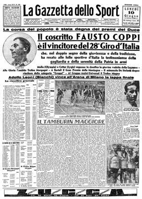 All’inizio degli anni 40, la storia dello sport italiano e della Gazzetta si intreccia con le vicende della Seconda Guerra Mondiale. Tutte le imprese, inevitabilmente, vengono interpretate attraverso la lente della retorica nazionalista. Così avviene il 10 giugno 1940, quando il ciclismo trova il Campionissimo: Fausto Coppi. Ha 20 anni e si presenta al Giro da gregario di Gino Bartali, ma i problemi meccanici del capitano nella Firenze-Modena gli valgono il via libera per vittoria di tappa e maglia rosa. Al coscritto Fausto, testimone della “gagliardia e della serenità della Patria in armi”, viene dedicata l’intera prima pagina. Il giorno dopo Mussolini dichiara guerra agli Alleati, schierandosi con la Germania nazista. La Gazzetta pubblica (come tutti i giornali) il discorso del Duce a piazza Venezia, quello del celebre “Vincere”. Da quel momento, le vicende belliche avranno sempre più spazio in prima pagina. Il 20 aprile 1941 il Bologna si aggiudica il 6° scudetto, pur perdendo 3-0 a Firenze. Il 22 la Rosea celebra i rossoblù interrogandosi (già allora) sulla crisi del bel gioco. L’apertura è per le operazioni delle nostre truppe in Albania.