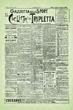 Lo studente in lettere Eugenio Camillo Costamagna (che nel 1894 aveva fondato a Torino “La Tripletta”), e l’avvocato Eliso Rivera, alessandrino di Masio ( che dal 1892 era il direttore della rivista milanese “Il Ciclista”) si incontrano e decidono di unire le forze. E così, dal matrimonio tra Il Ciclista e La Tripletta (periodici di ciclismo) nasce La Gazzetta dello Sport. All’inizio è un bisettimanale con uscite il lunedì e il venerdì, visto che le prime gare in bicicletta e le corse dei cavalli si tengono solitamente la domenica e il giovedì. La sede, nei locali dell’editore Sonzogno, è in Via Pasquirolo, sotto allo sguardo del Duomo. Il primo numero, 4 pagine di colore verde pallido (per distinguersi dalle altre Gazzette d’informazione), costa 5 centesimi. Per il secondo bisognerà aspettare il martedì 7 aprile “… Per dar riposo agli operai in occasione delle feste pasquali”. E sulla seconda uscita si celebrano con entusiasmo le 20 mila copie vendute.