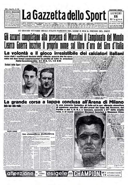 La finale a Roma, stadio del Pnf (Partito nazional fascista), 50 mila spettatori. Avversaria la Cecoslovacchia, superfavorita. Dirà Vittorio Pozzo, ct azzurro: «Ma il nostro tasso tecnico è semplicemente favoloso». La sfida è entusiasmante, vincono gli azzurri 2-1 dopo i tempi supplementari. Gol di Puc, Orsi e Schiavio. In campo anche l’italo-argentino, l’oriundo Luisito Monti: sarà l’unico giocatore nella storia ad aver disputato due finali con maglie diverse, nel 1930 contro l’Uruguay e nel 1934 contro la Cecoslovacchia. L’Italia diventa campione grazie al miglior attacco: 12 reti in 5 partite. In questa edizione per tre volte si è dovuto ricorrere ai supplementari, e per ben due volte questa fatica è toccata all’Italia.