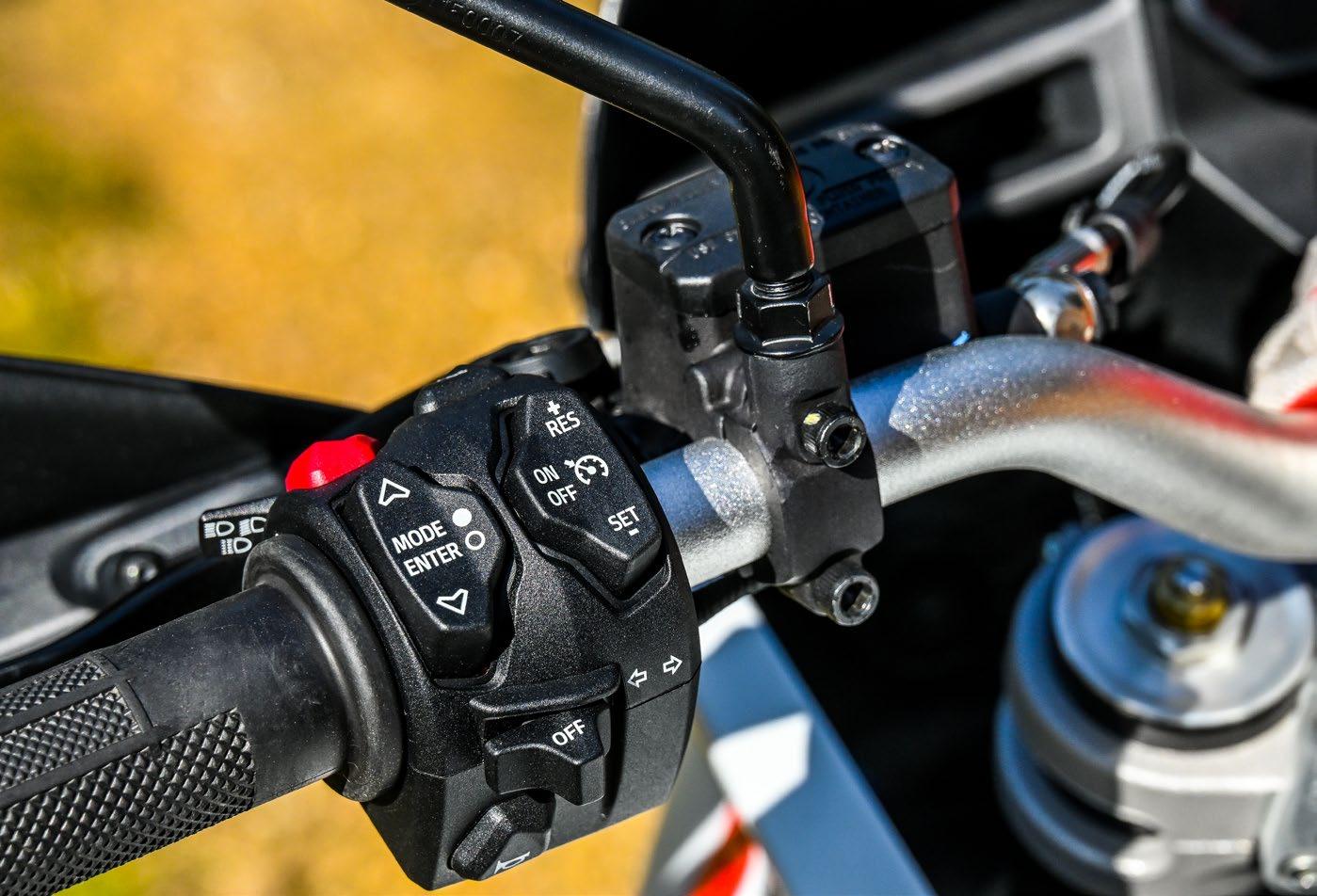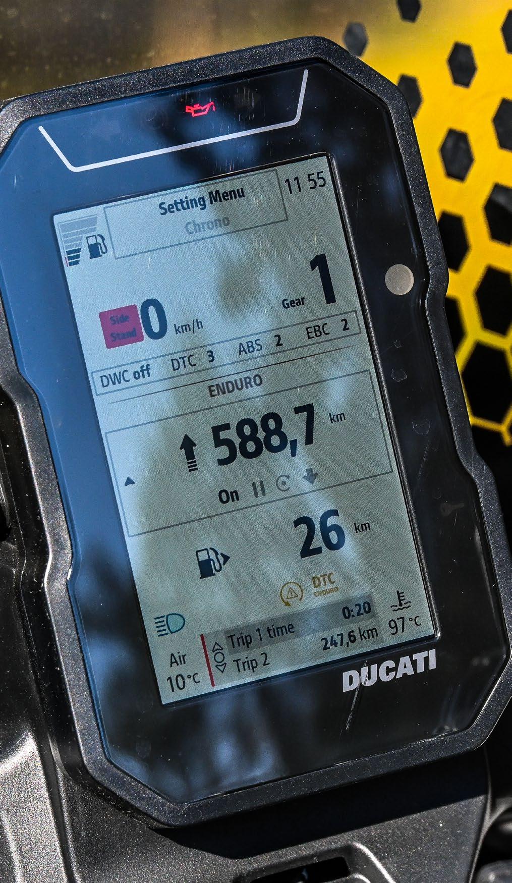 χιλιόμετρα και αν γράψει το ψηφιακό πολυόργανο των 5 ιντσών, που είναι τοποθετημένο στο καντράν πίσω από την διάφανη μάσκα τύπου Rally, η μοτοσικλέτα στην όποια πίεση στη μανέττα του μπροστινού φρένου, σταματάει και σε ακινητοποιεί σε χρόνο dt. Παρόλο που είναι εφοδιασμένη με ABS τύπου cornering της BOSCH, δεν το χρειαστήκαμε πουθενά. Σε συνδυασμό με το πίσω φρένο των 265 χιλ. μονού δίσκου με διπίστονη δαγκάνα της Brembo και εξίσου με το ίδιο