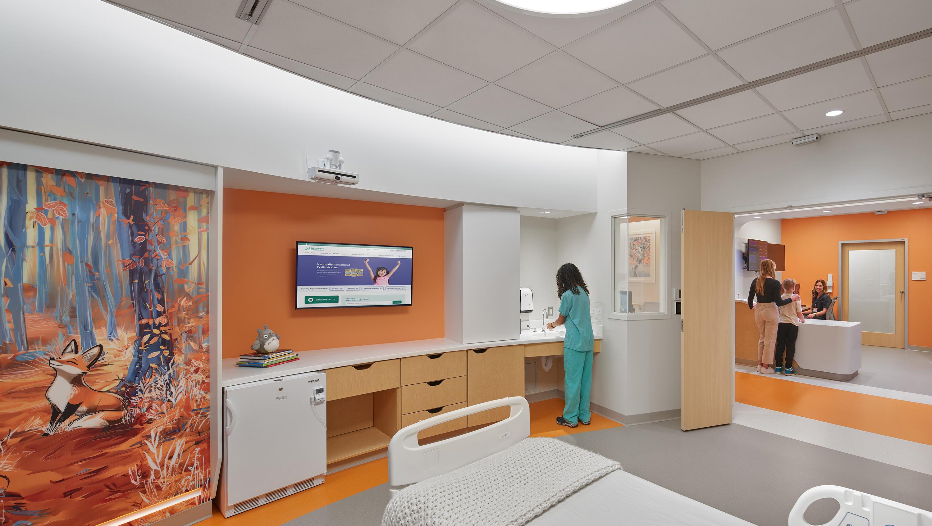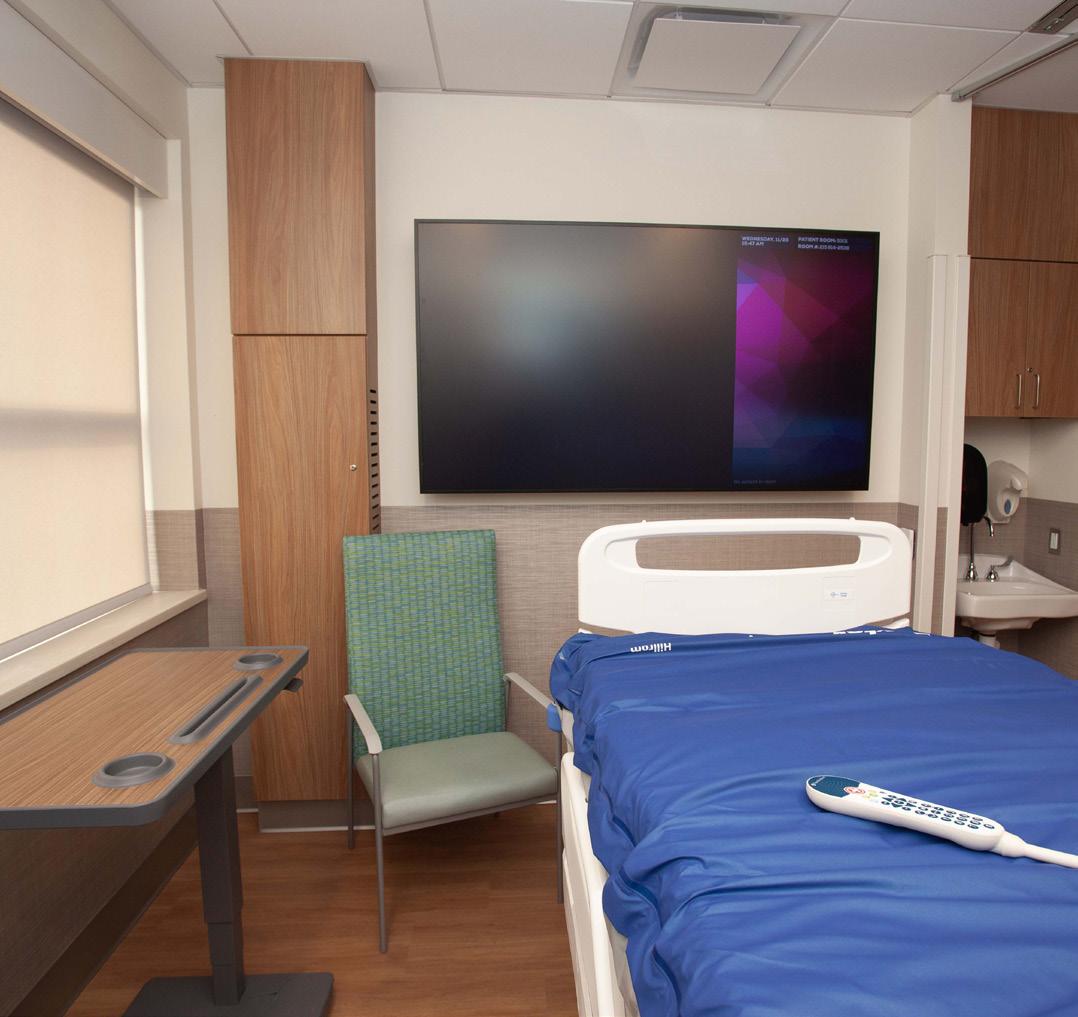 At the core of this transformation was the integration of advanced technology. The Intelligent Room Integration System (IRIS) became the brain of each patient room, automating functions to enhance both comfort and efficiency. Medical staff could operate more effectively in a streamlined environment while patients would have control over lighting, climate, and entertainment with the touch of a button. To improve the patient experience, a 75-inch monitor was installed in each patient room, allowing patients or families to simultaneously see information about their medical care and stream television, play video games, or listen to music. A sophisticated lighting, temperature, and shade controls system via pillow speaker was also introduced, allowing patients to adjust these systems for their comfort.