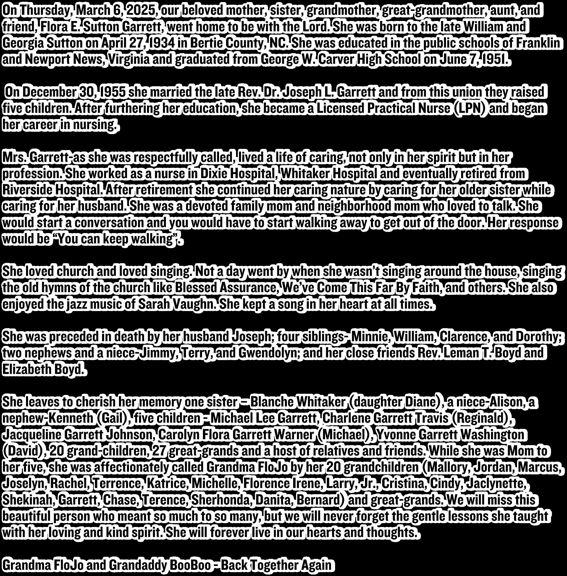The family of Flora Garett would like to thank each of you for the outpouring of love, support, and prayers during this time. you for being there for us. Special thanks to Gethsemane Baptist Church, C. C. Carter, Pollard's Florist, We Three Rick's Girls Catering, and Family and Friends for your acts of love and support. May God bless each of you.