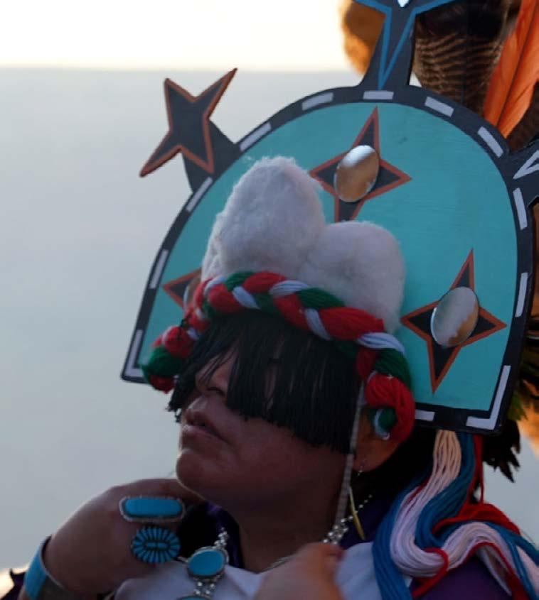 The Cellicion Zuni Dancers are world renowned for their performances of traditional Zuni Pueblo social songs & dances. They performed at Desert View this year. Here, they prepare for the Star Dance: “Within this headdress, most of the heavenly beings are represented. The blue represents the sky, the black is the night, the white line along the edge is the Milky Way. The three stars on top are the morning, evening, and north stars.” Click here to watch the Minute Out In It film of their performance!