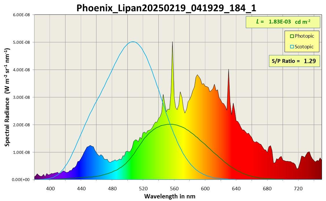 Stephen Hummel also analyzed the kind of light intruding into the park from surrounding cities. Below, a spectral radiance graph shows the wavelength of light emanating from Phoenix as seen from Lipan Point. Shorter wavelenghts (the blue end) are much more harmful to night skies than the longer wavelengths (the red end).