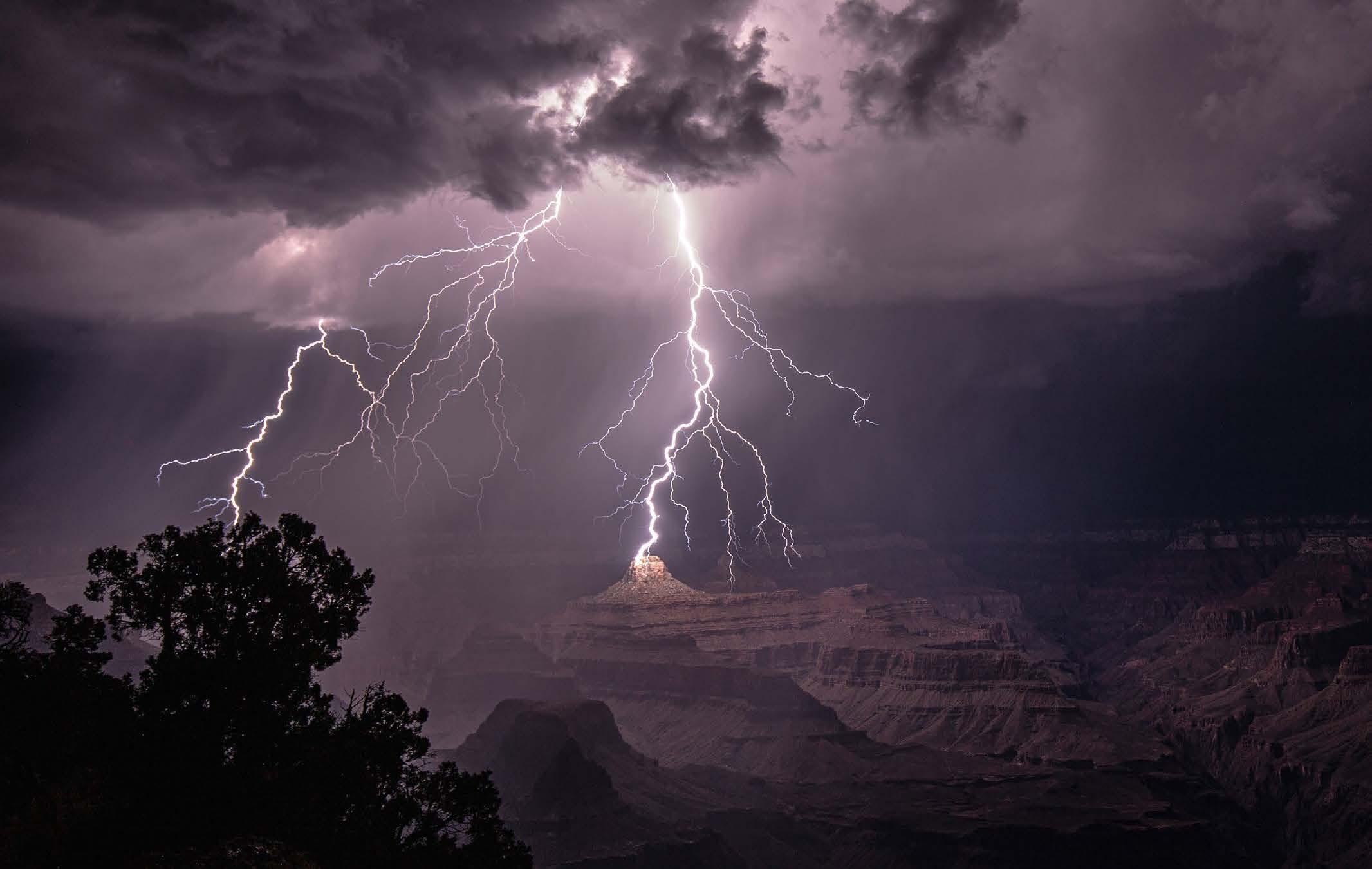 Night photography doesn’t always have to be about the stars! Ranger Matt Young of the Dark Skies Team takes amazing photographs of the Grand Canyon which focus on all the beauty found in the dark. (Above) Lightning strikes over the distant Canyon at night, their flash illuminating the surrounding temples. (Below), A full moonrise over Desert View Watchtower.