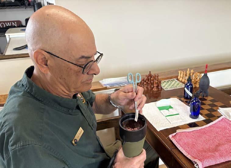(Left) Astro VIPs Dave and Paul conduct outreach with the park’s brand new H-Alpha solar telescopes. (Right) Astro VIP Paul professionally cleans the spotting scopes. Thanks, Paul!