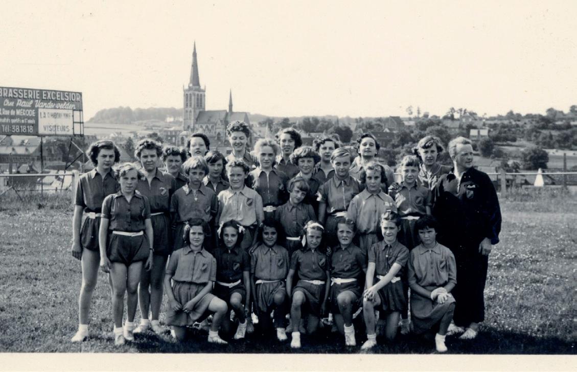 De Sint-Pietersturngilde poseert in de jaren 50 op de voetbalvelden aan de Tentoonstellingslaan. Op de achtergrond zie je het – toen nog – landelijke Jette, en de toren van de SintPieterskerk. In die tijd luisterde de gilde plaatselijke feesten en processies op. Uiterst links op de foto, op de derde rij, herken je Renée Stoefs. Herken jij verder nog iemand op de foto? Of kan je meer vertellen over deze turnclub, die meer dan 60 jaar heeft bestaan, zeker tot in de jaren 80? Of bezit jij een gelijkaardige foto of cruciale informatie die de vrijwilligers van de erfgoedbank kunnen helpen in hun speurtocht? Neem dan contact op.