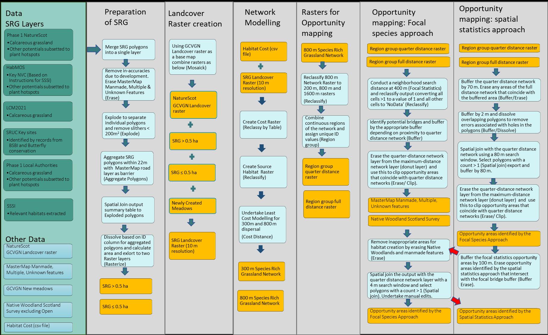 Here we provide a framework to remotely identify species-rich grasslands, map the extent of their networks, and identify opportunity areas where habitat creation could enhance ecological connectivity. To our knowledge this is the first-time that species-rich grassland networks have been identified through a combination of local knowledge, spatial datasets, and biological records to provide a more comprehensive overview of potential networks. In focussing specifically on species-rich grasslands, and including all grassland types (i.e. neutral, calcareous and acid grasslands), the work moves beyond previous network analyses for neutral grassland carried out by the GCRGN.
