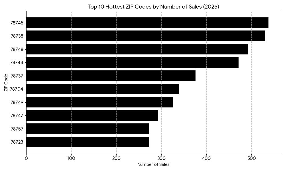 South Austin Dominance: ZIP codes 78745 and 78748 were major engines for the city's sales volume, recording 538 and 492 sales respectively. Their blend of classic Austin character and relative mid-market accessibility continues to make them a top priority for buyers.
