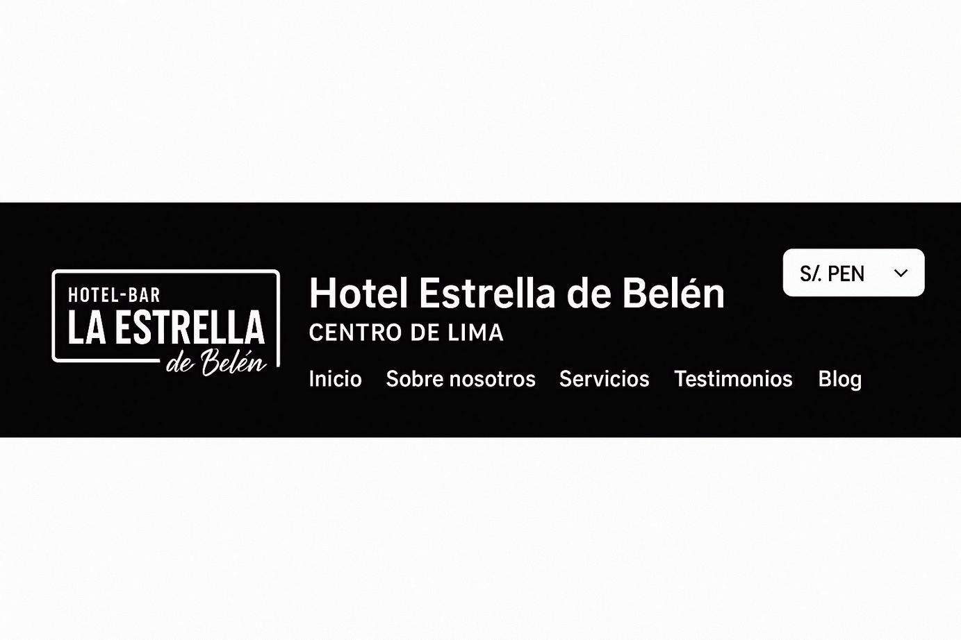Allí está el logo del hotel y un menú de navegación con enlaces rápidos como: Inicio, Sobre nosotros, Servicios, Testimonios, Blog y Contacto.