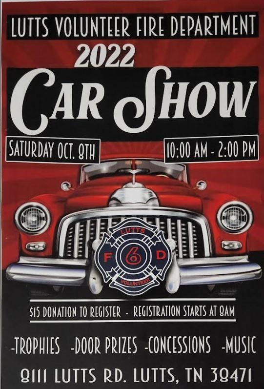 OCT 8: Lutts TN: Lutts Volunteer Fire Department Car Show: Event to be held at 8111 Lutts Road. Times: 10:00am 2:00pm, Registration starts at 9:00am, $15.00 Donation to register, Trophies, Door Prizes, Concessions, Music.