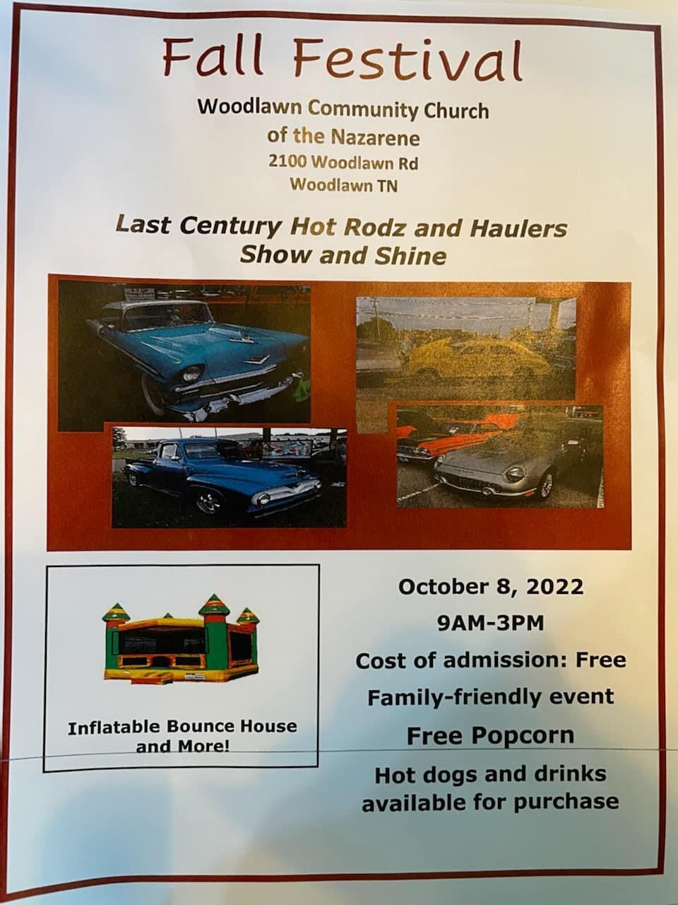 OCT 8: WOODLAWN TN: WOODLAWN COMMUNITY CHURCH FALL FESTIVAL: Show & Shine, Free Family Event, Popcorn, Hot Dogs & Drinks Available to Purchase. Bounce House and More. Time 9am 3pm. Location 2100 Woodlawn Rd (Woodlawn Church)