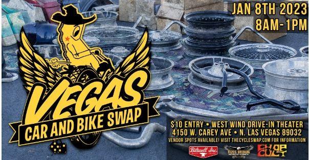 SWAP: Buy, sell, trade. New, used, and one-of-a-kind. Vintage, custom, one-off, and antique. British, Japanese, European, and American Big Twin. Dirt, drags, track, and street. You name it you’ll probably find it at the Vegas Car & Bike Swap. Go here to pre-register and save money by registering online. Online registration closes on Wednesday, November 30th, at midnight. All vendors, whether registered online or paying cash the day of the event, will be granted access on a first come, first served basis, beginning at 7 am. The spectator gate opens @ 8:00 a.m. $10 entry for spectators. Kids under 12 are free. The swap is located at the West Wind Drive-In Theater at 4150 W Carey Ave. For more info go to www.thecycleswap.com