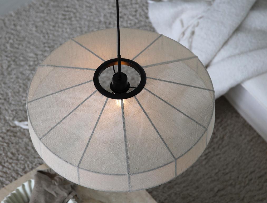 Alia och Aiko visar hur textil och metall kan kombineras i en balanserad form. Den beige linneskärmen omges av en svart ram som ger en tydlig kontrast. Alia passar väl över matbordet, medan Aiko fungerar fint i vardagsrum, hall eller över ett mindre bord.