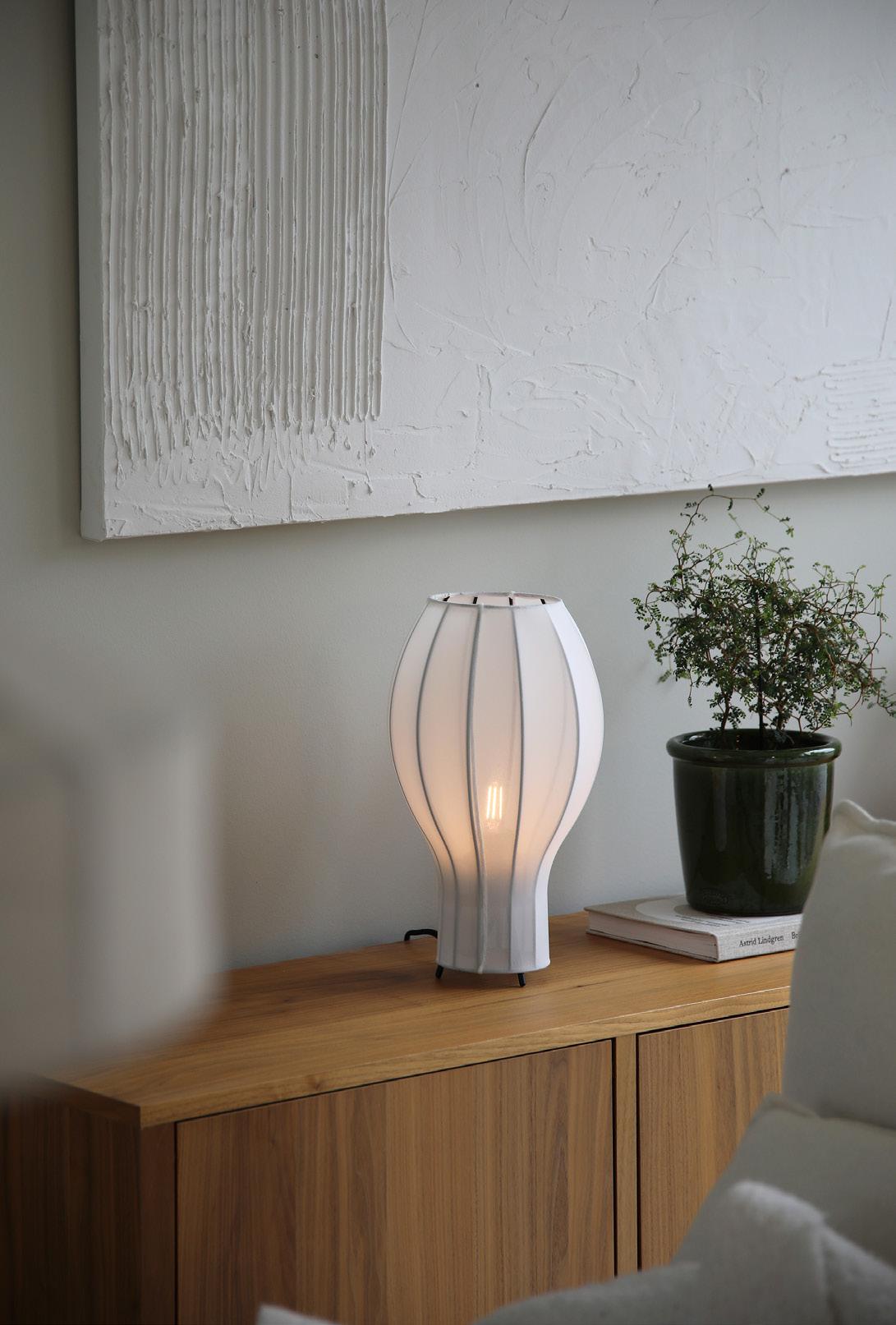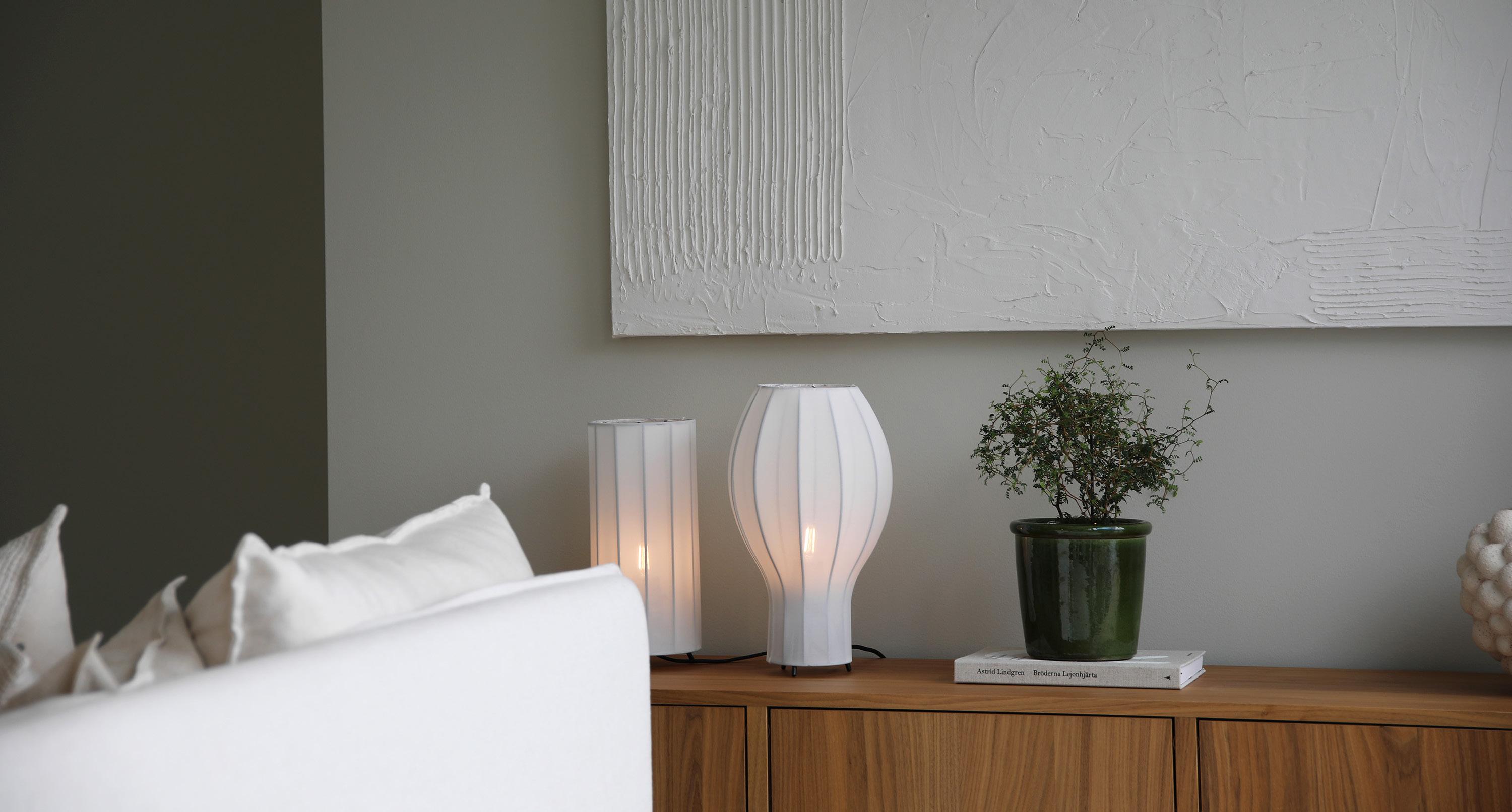 Hikari och Globo är två bordslampor i vitt tyg med svart stomme. Hikari har en mer skulptural form med synlig ram som framträder när lampan är tänd, medan Globo har en rundare skärm som ger ett mjukt ljus. Båda fungerar bra på nattduksbord, sidobord eller skrivbord och är dekorativa även när de är släckta.