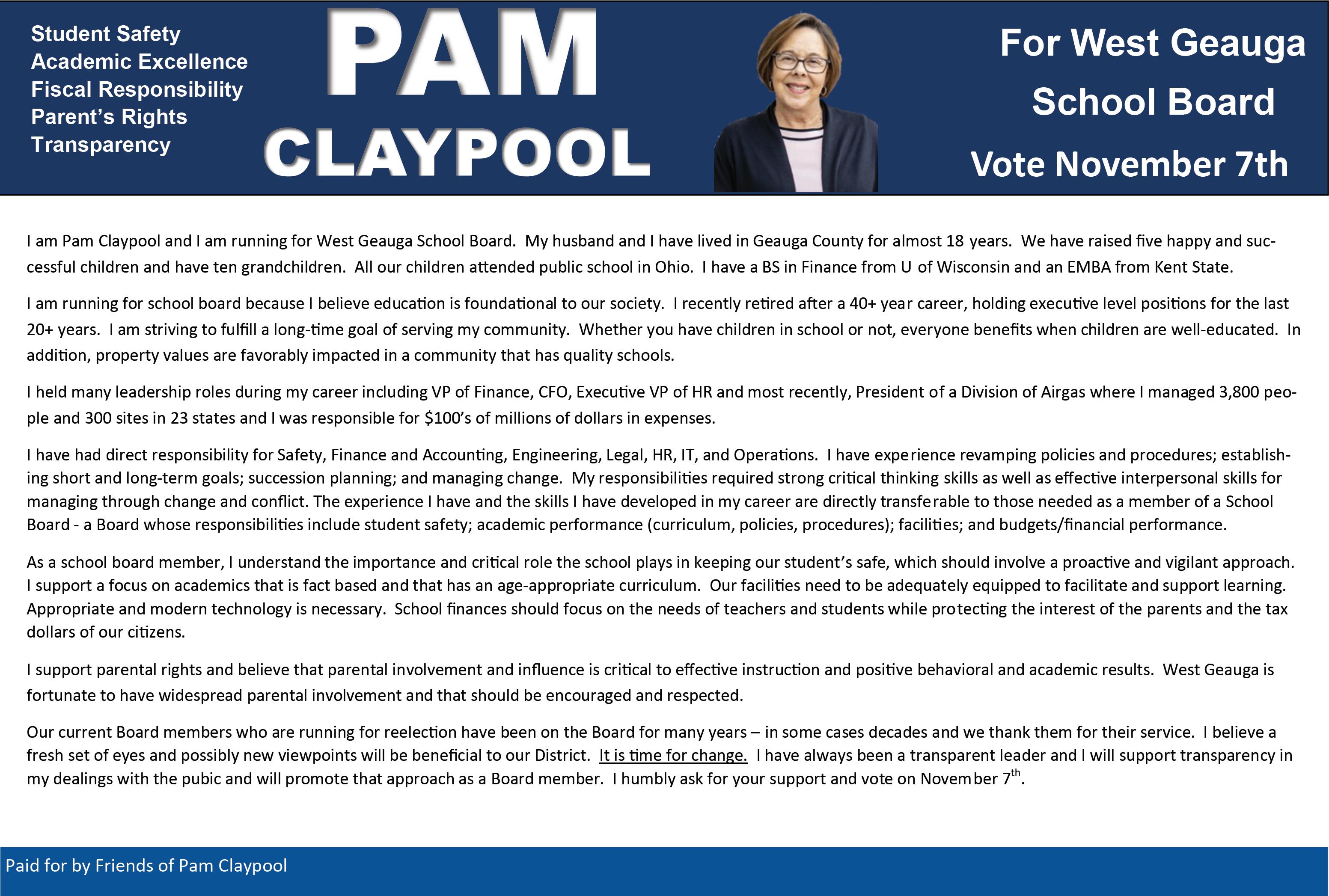• The opinions and representations contained in advertisements are those of the advertiser. They have not been verified by the Chesterland News, LLC, nor should they be construed to represent the position or viewpoint of this newspaper or its publisher.