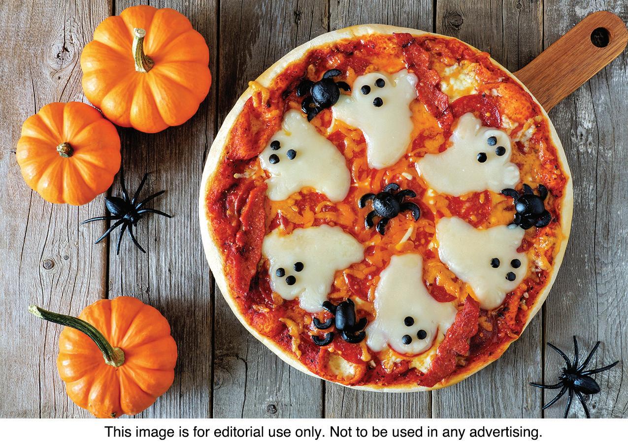 • Pizza mummy: Use slices of toasted sandwich bread or English muffins to make some spooktacular fare. Coat the bread with pizza sauce. Then place thin vertical slices of mozzarella cheese in a haphazard pattern to replicate the look of gauze on a mummy. Two pieces of sliced black olives serve as the eyes.