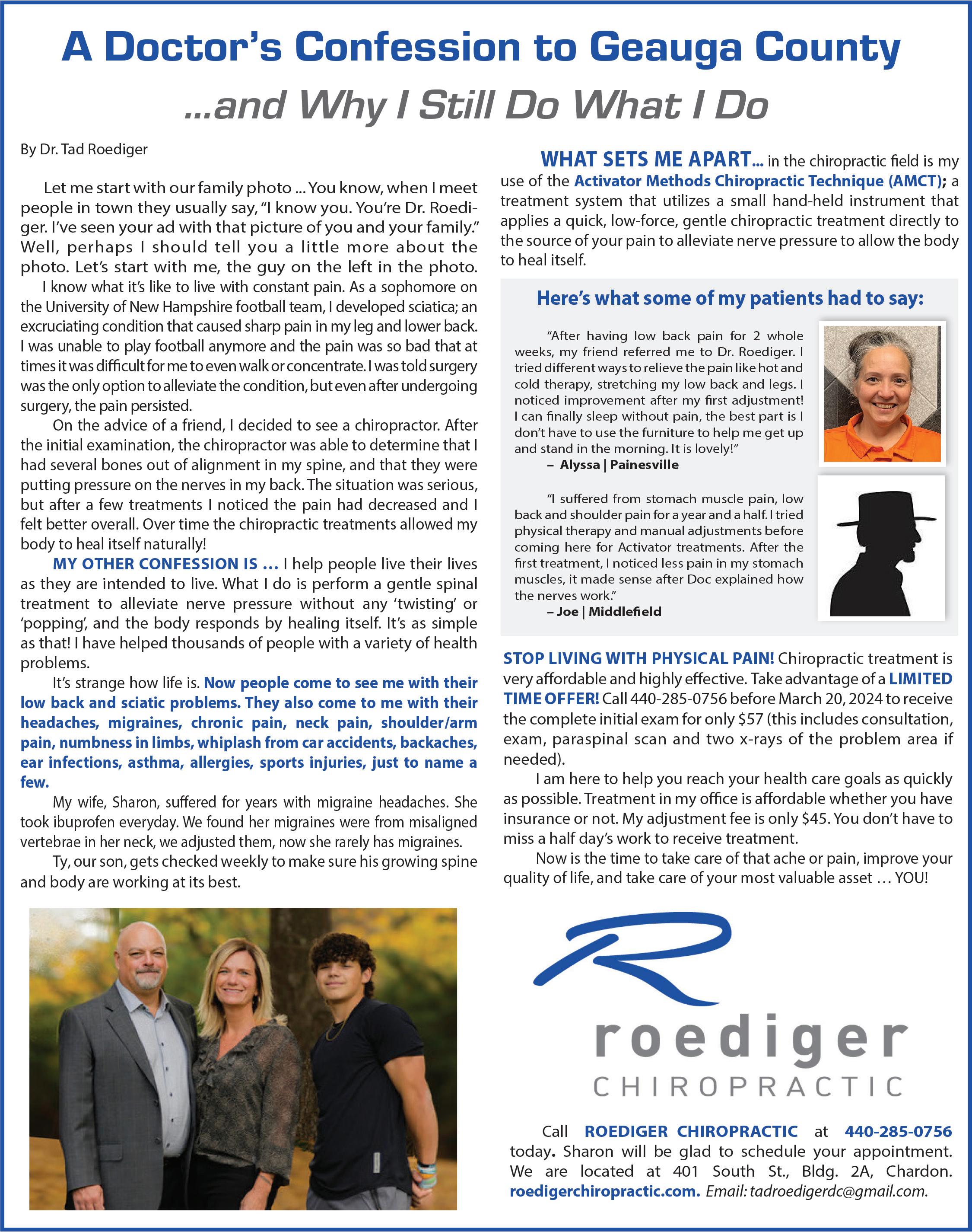 March 2024 Page 4 GeaugaNOW Magazine PURE MAPLE SYRUP 4875 Georgia Road Middlefield, OH 44062 440-478-6201 We ship FedEX or USPS • Call or Write for More Info 4875 G i R d • RETAIL • BULK • WHOLESALE *We are no longer selling syrup making equipment, but will continue to be a Sunrise metal dealer and do tubing installations. K E Our syrup is great for cooking!