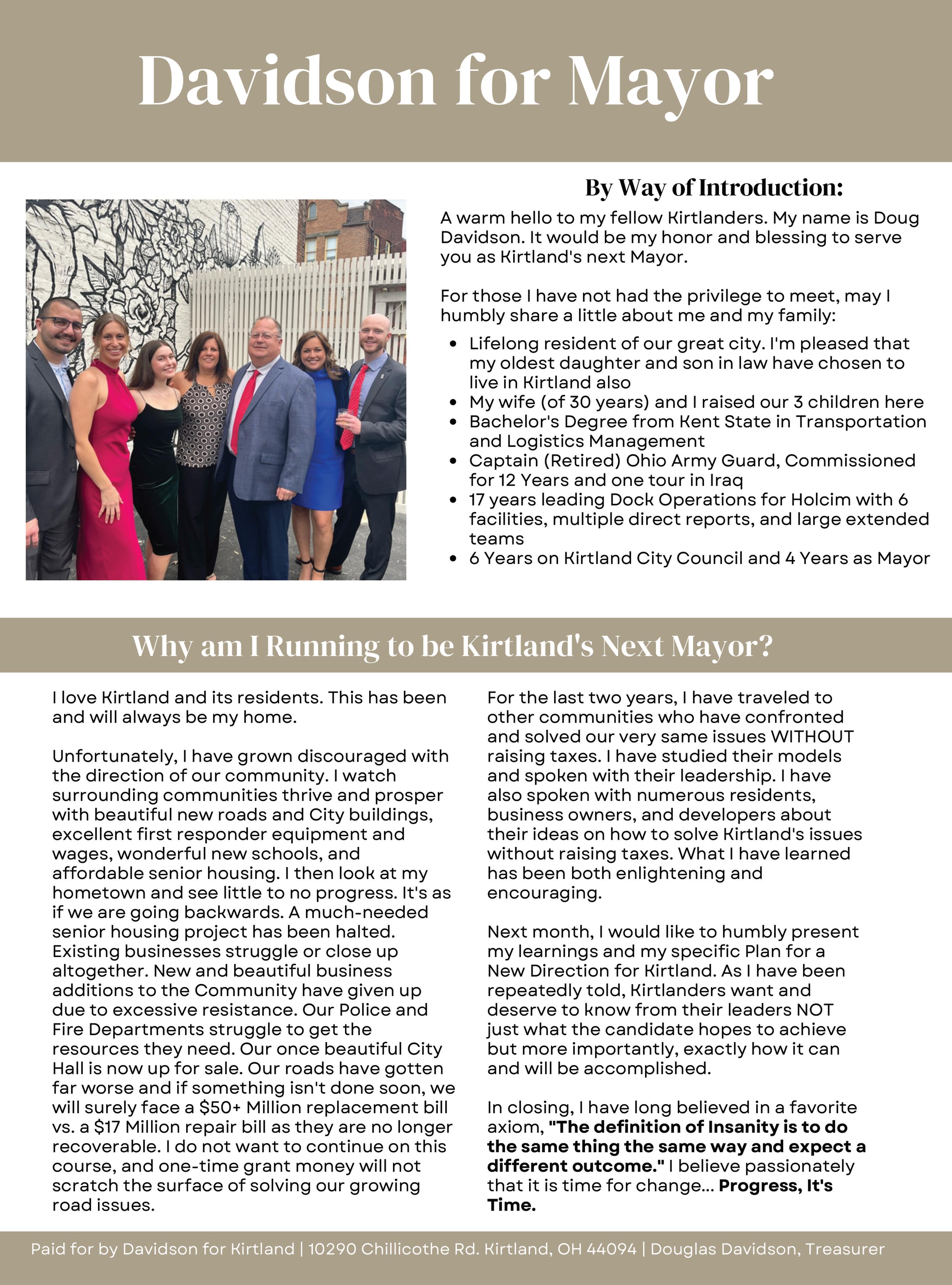 project at the senior center. In the meeting, we covered many key points as to what the process to make a good decision should look like. The good news is, and I can’t stress enough, we do not have to go forward with any development on Kirtland City Hall property. Kirtland is great the way it is and if the merits and plan aren’t just right for the community, then redevelopment of city hall property should not go forward.