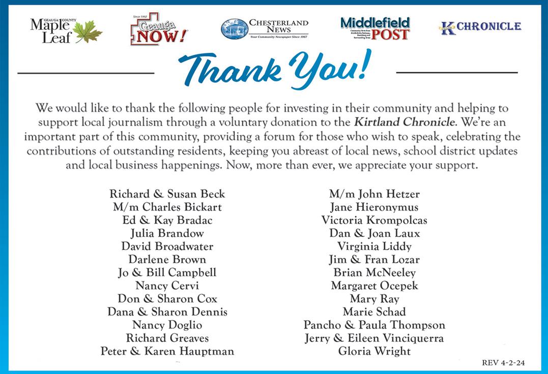 • The space reservation deadline for paid advertisements in that month’s Kirtland Chronicle is noon on the Monday prior to the first Friday of each month. Late ads may be accepted at the discretion of management.