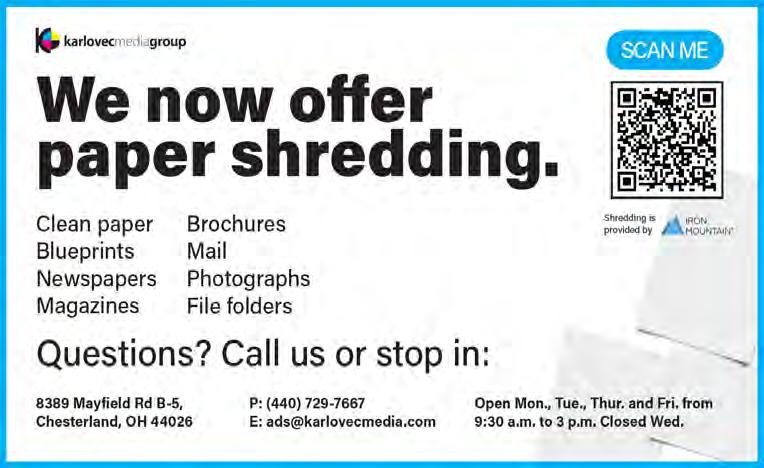 Did you know Karlovec Media Group prints business cards? Prices start at only $30 for 500 (B&W, 1-sided, no bleed). Call 440-729-7667 or email ads@karlovecmedia.com. Experienced housekeeper, will help clean, do laundry, and more, in Geauga county. 440-313-1804.