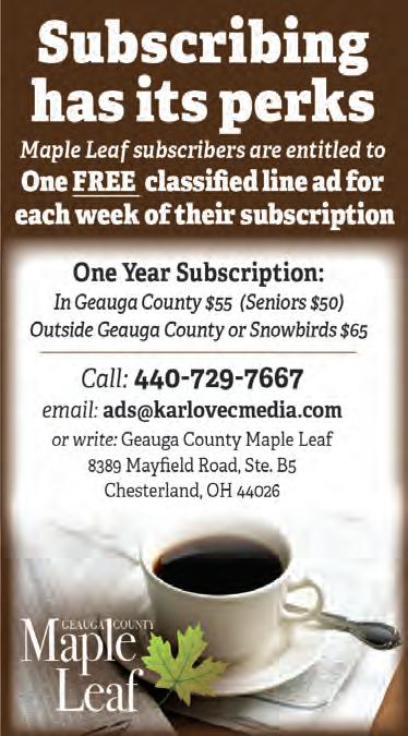 •Geauga County Maple Leaf (USPS 011-535) is published weekly by Geauga County Maple Leaf LLC. 8389 Mayfield Road, Ste. B5, Chesterland, Ohio 44026. Periodicals postage paid at Chardon, Ohio 44024. POSTMASTER: Send address changes to Geauga County Maple Leaf, P.O. Box 1166, Chardon, OH 44024-5166. Subscribers should notify the publisher in writing of address changes or unsatisfactory delivery.